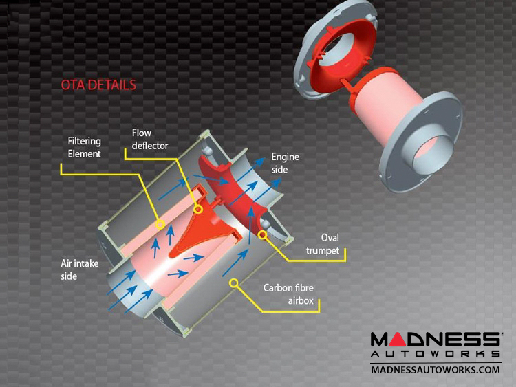 Cold fresh air is forced from the air feed straight through the BMC OTA enclosed air filter, directly into your engine. As The BMC OTA (Oval Trumpet Air-box) is made from carbon fiber. This design does not receive any heat soak from engine bay temperatures, as would be commonly found on open induction kits
