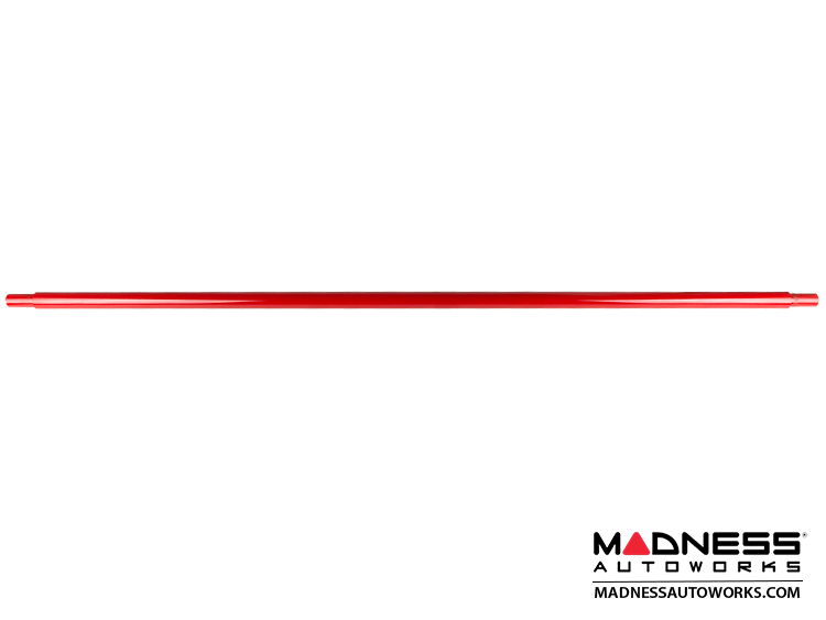 Our MADNESS Rear Torsion Bar is crafted from 4130 Chromoly Steel for increased strength, with a Red powder coated finish and treated for added durability. The material along with its manufacturing and treatment process leave us with a bar that is larger and stiffer than the factory setup without adding a significant increase in weight when compared to the OE Torsion bar.