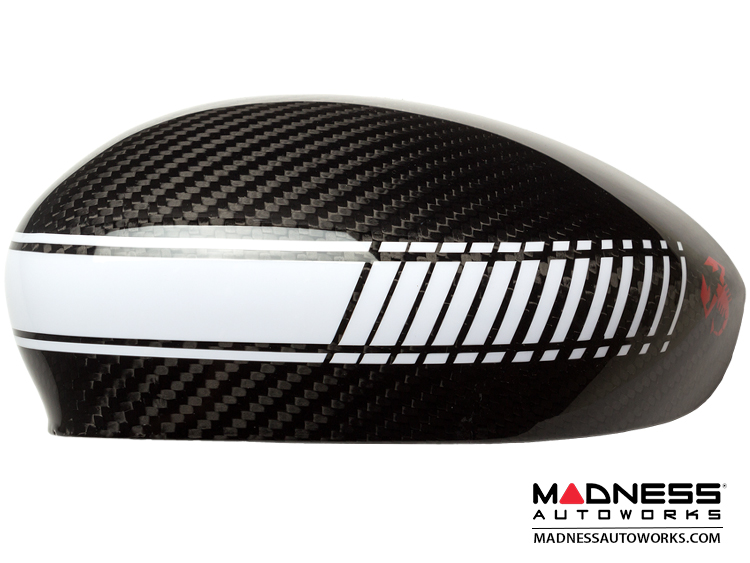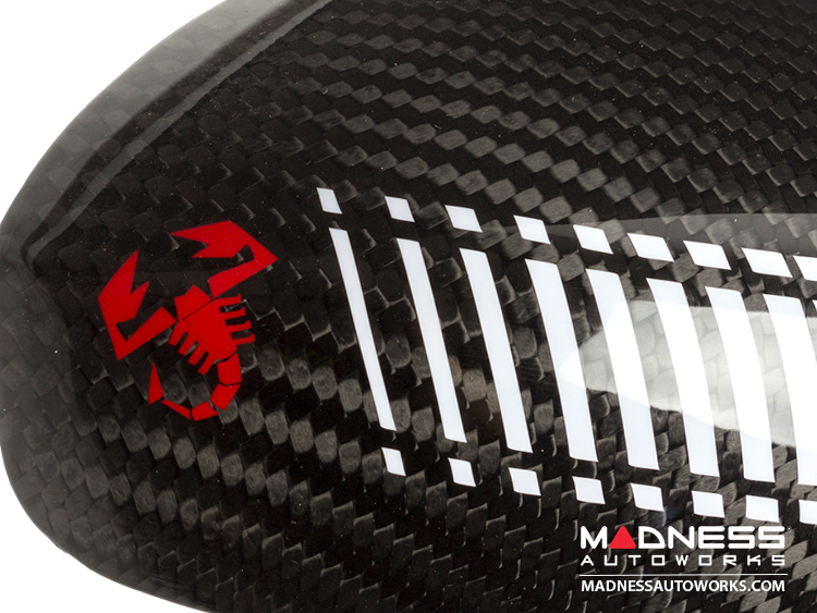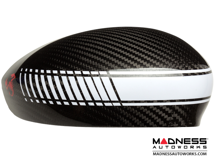 FIAT 500 Mirror Covers - Carbon Fiber - White Racing Stripe w/ Red Scorpion