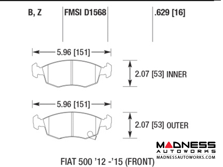 These FIAT 500 Brake Pads by Hawk are High Performance Street 5.0 Pads. They are a Ferro-Carbon compound brake pads that provide advanced braking characteristics to enhance the driving experience. This new compound combines the safety and quality of aerospace design partnered with the braking technology of motorsports, the results are shorter stopping distances, improved performance under heavy braking conditions and street car friendly characteristics.