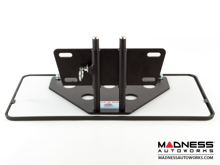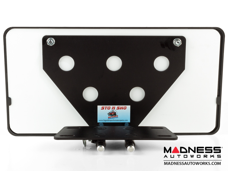 The STO N SHO is a two piece detachable front license plate mounting system consisting of a front license plate holder and a base mounting plate that allows for the easy removal of the front license plate when desired and the quick replacement of the front license plate when needed. When the front license plate holder is removed the remaining base plate is virtually undetectable. The STO N SHO allows you to comply with state law while maintaining the beauty of your FIAT 500X.