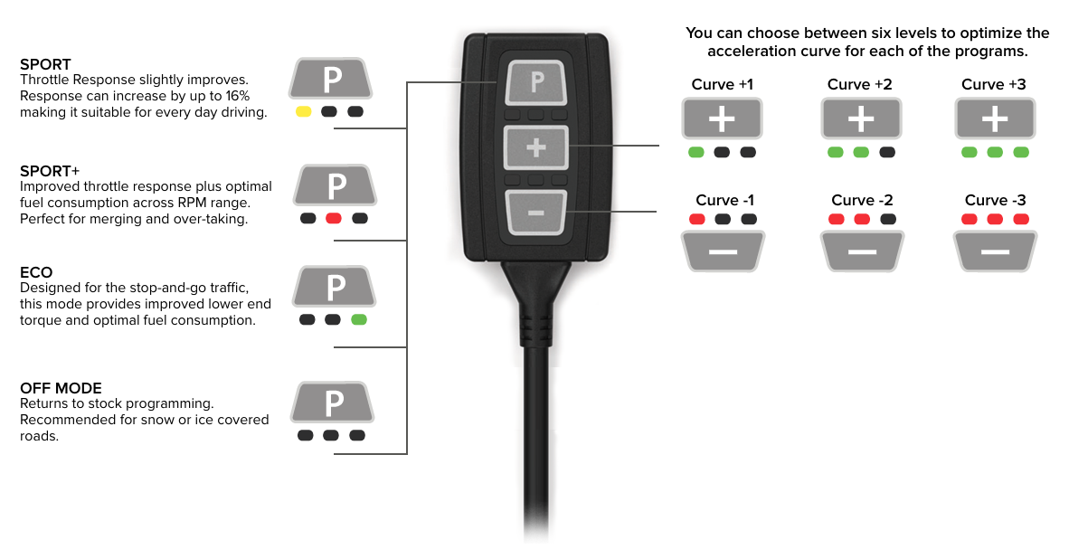 You can choose between six different levels of adjustment on each mode. The Green Curves (+) will make the current mode you are on progressively more aggressive on each positive curve. The Red Curves (-) will make the current mode you are on progressively less aggressive on each negative curve.