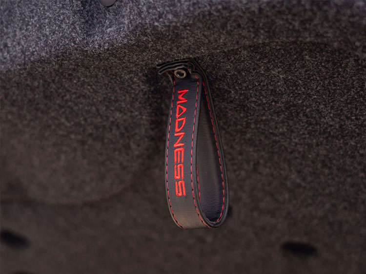 Upgrade the interior of your FIAT 500 with this custom Black leather Trunk Handle / Pull Strap featuring the MADNESS logo stitched in Red. Say goodbye to the flimsy nylon strap that comes standard and elevate the style and functionality of your cargo hatch.