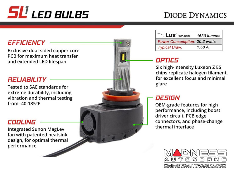 Driven. Rather than a simple buck regulator found on other bulbs, the SL1 uses a unique boost-mode circuit, which prevents thermal imbalance in the LEDs over time - again, just like you would find in OEM LEDs. It also has transient protection for long life in automotive circuits. Diode Dynamics engineers also analyzed dozens of OEM electrical systems, and added current-monitoring circuitry to mimic the electrical characteristic of halogen bulbs, drastically reducing the need for CAN-BUS adapters (though they're still needed on some applications).